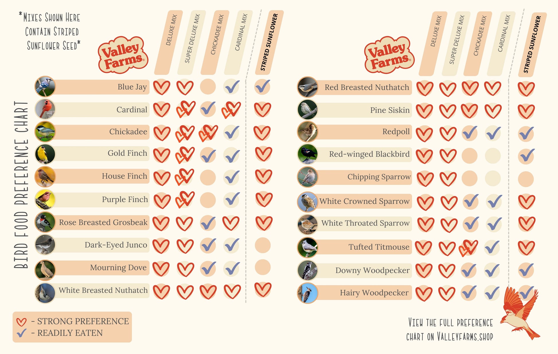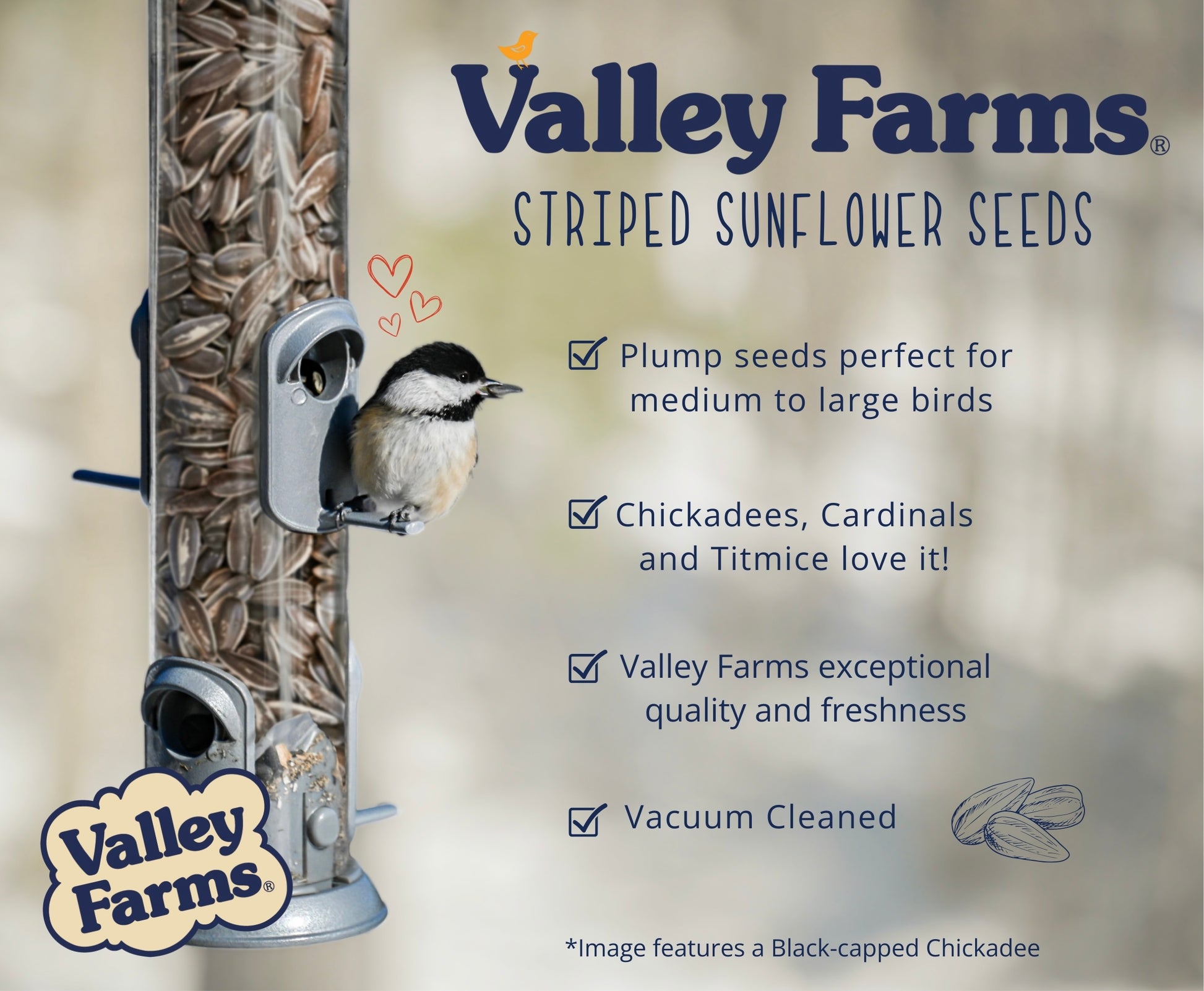 Valley Farms Striped Sunflower Seed is a terrific source of energy for wild birds who need high protein in their diets. Cardinals, grosbeaks, sparrows, titmice, and nuthatches will readily eat this seed. Even the finches will enjoy it. You will attract a multitude of bird species with this clean, straight seed product.