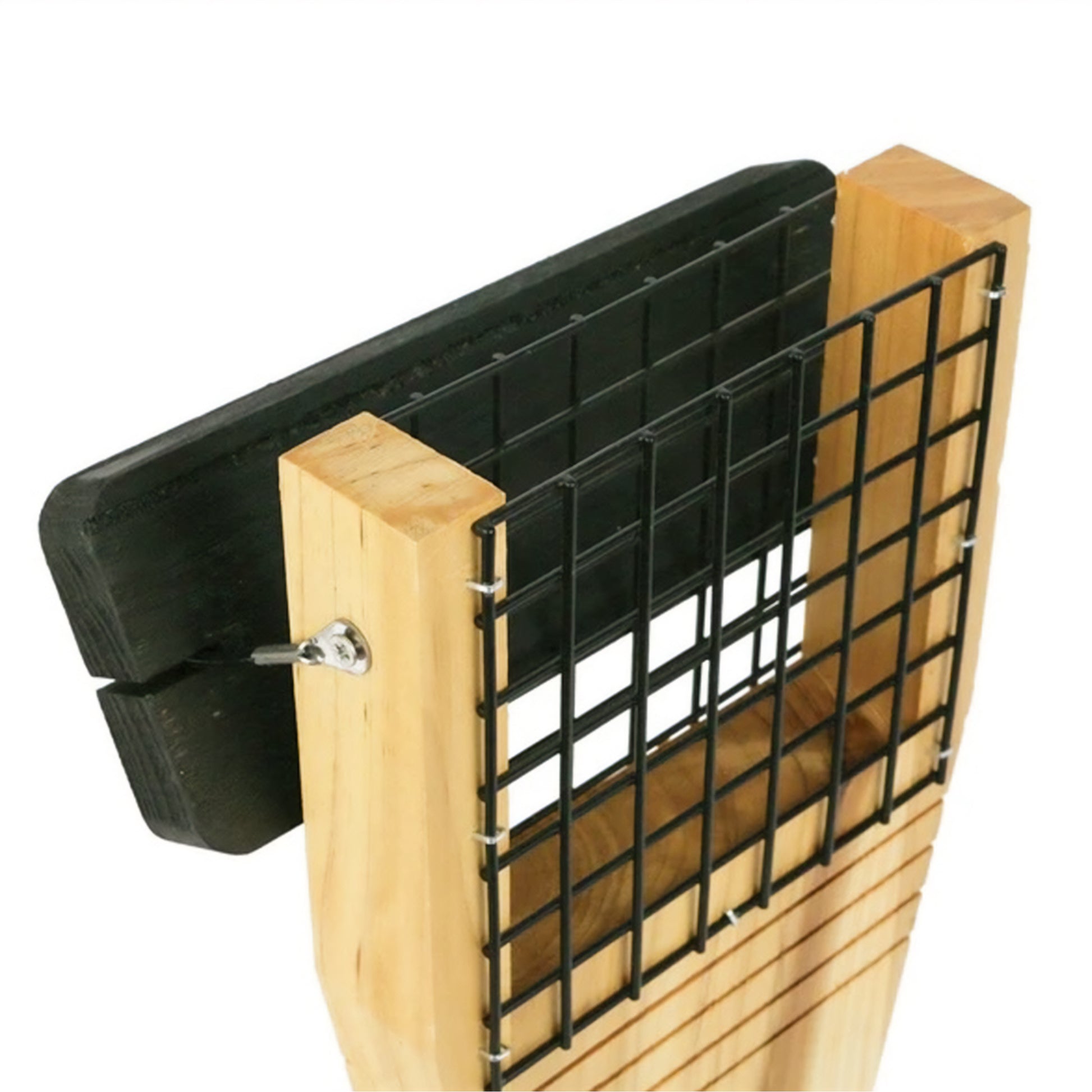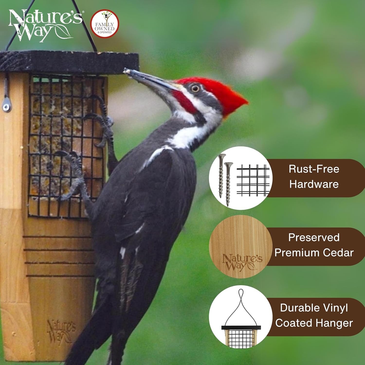 The Cedar Tail Prop Suet Feeder by Nature's way is constructed with premium insect and rot resistant cedar. It features an extended tail prop designed to accommodate larger woodpeckers. This tail prop has four kerfs to provide additional gripping surfaces and its extended length for larger woodpeckers to comfortably rest their tails on. The comfortable feeding will keep birds eating longer. The hardware is all rust-free and the mesh is powder coated steel. The feeder has an easy fill design and hangs with a vinyl coated steel wire.