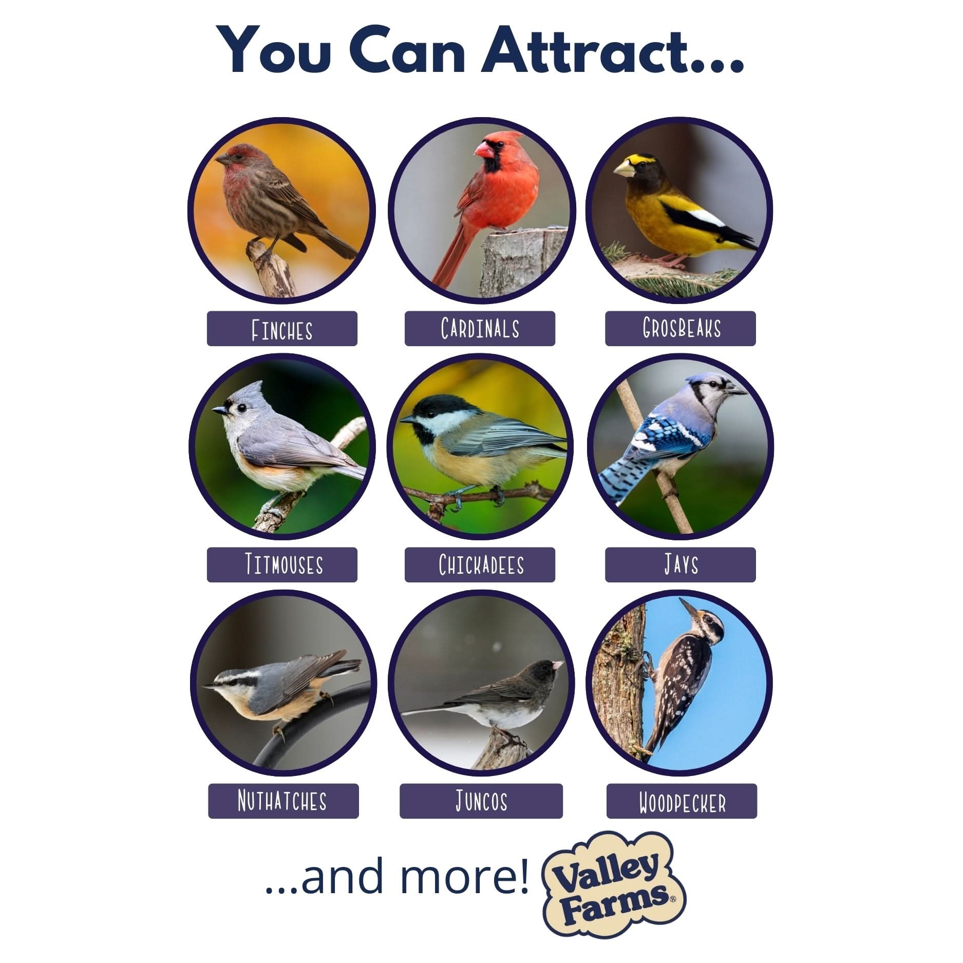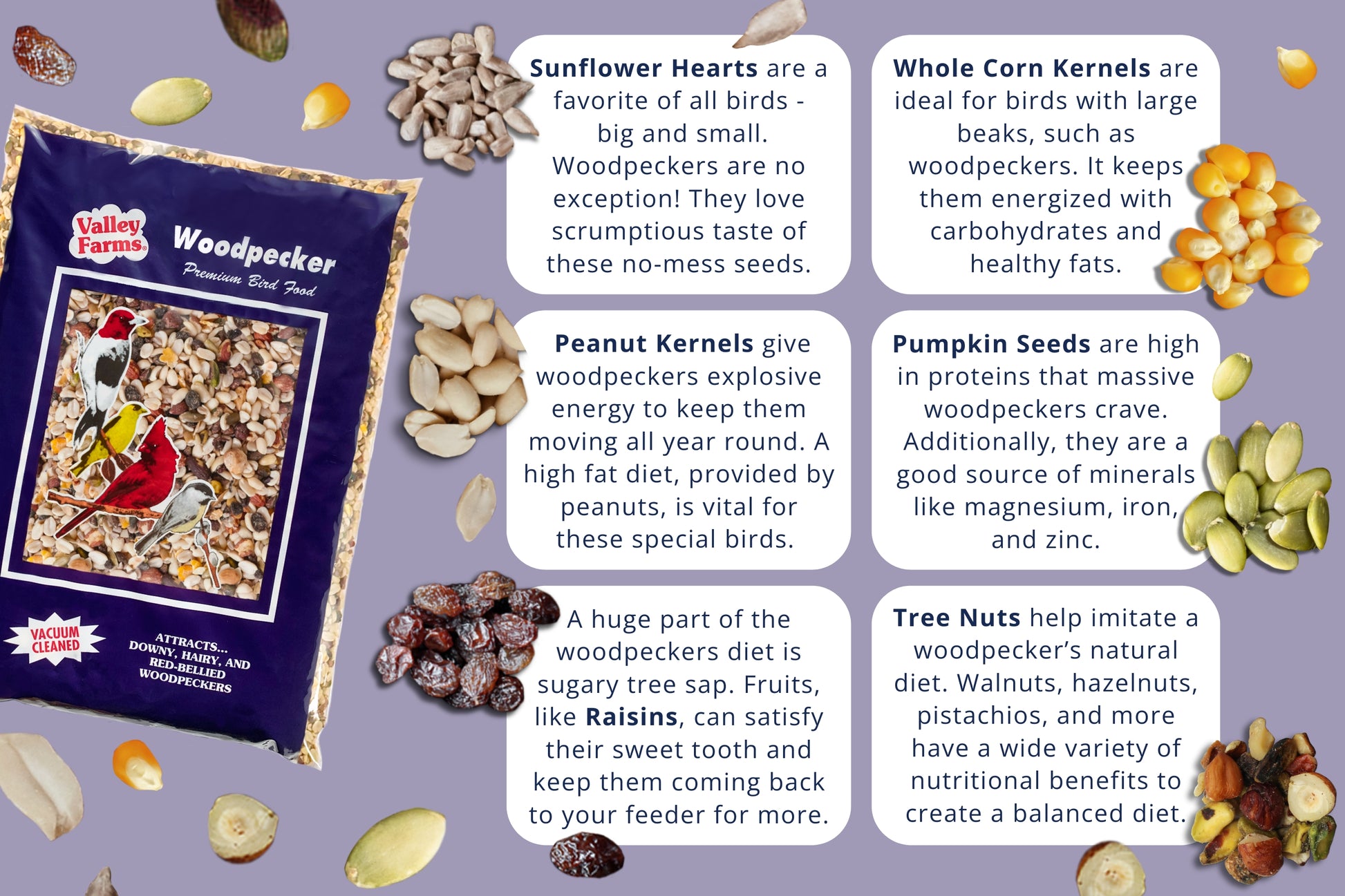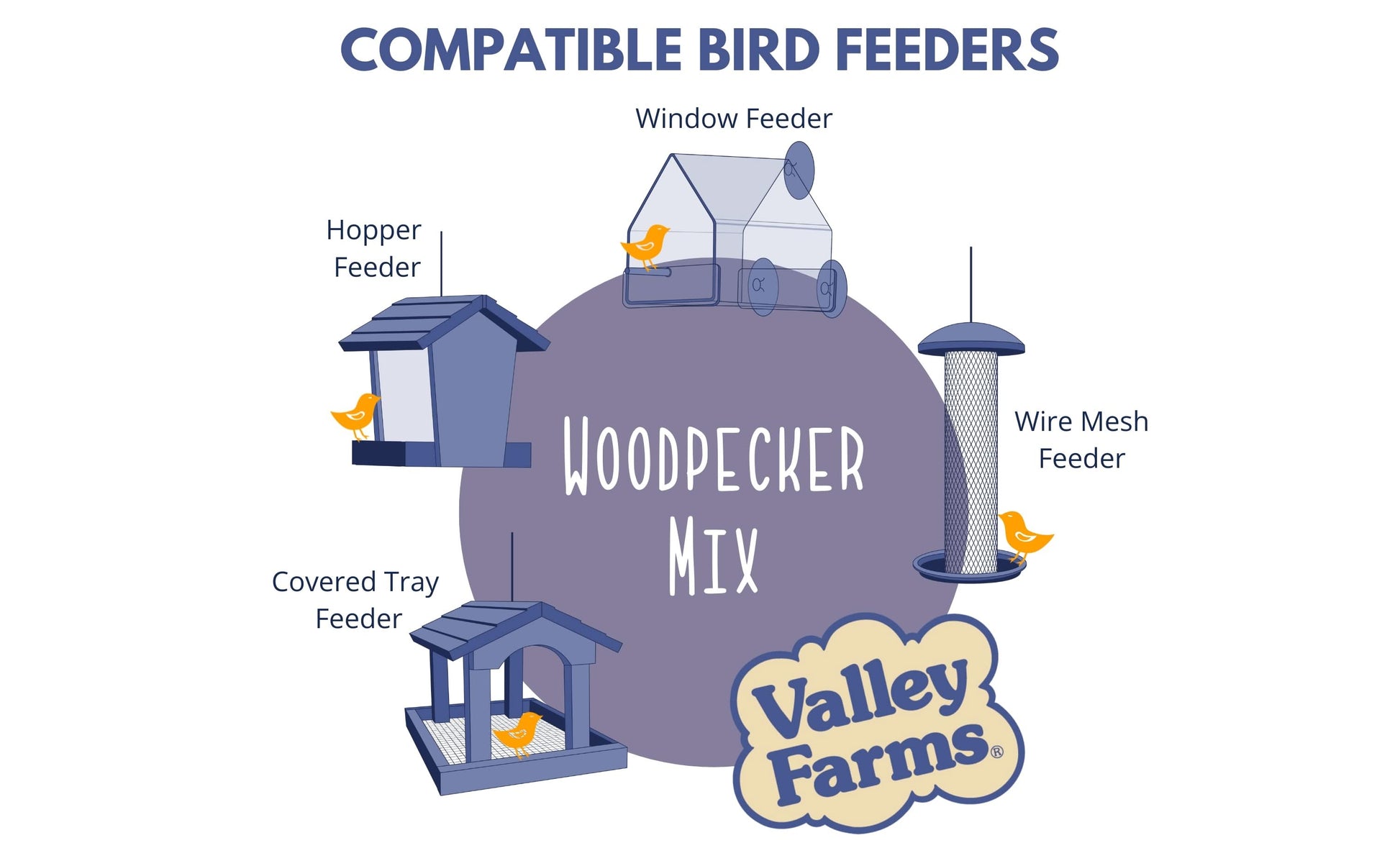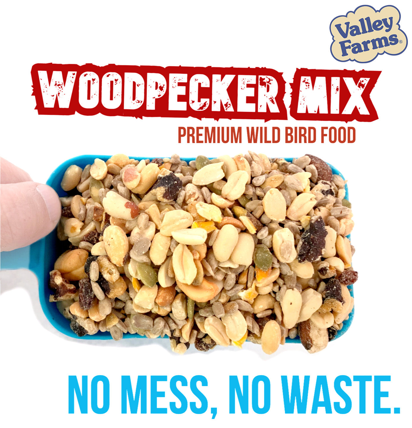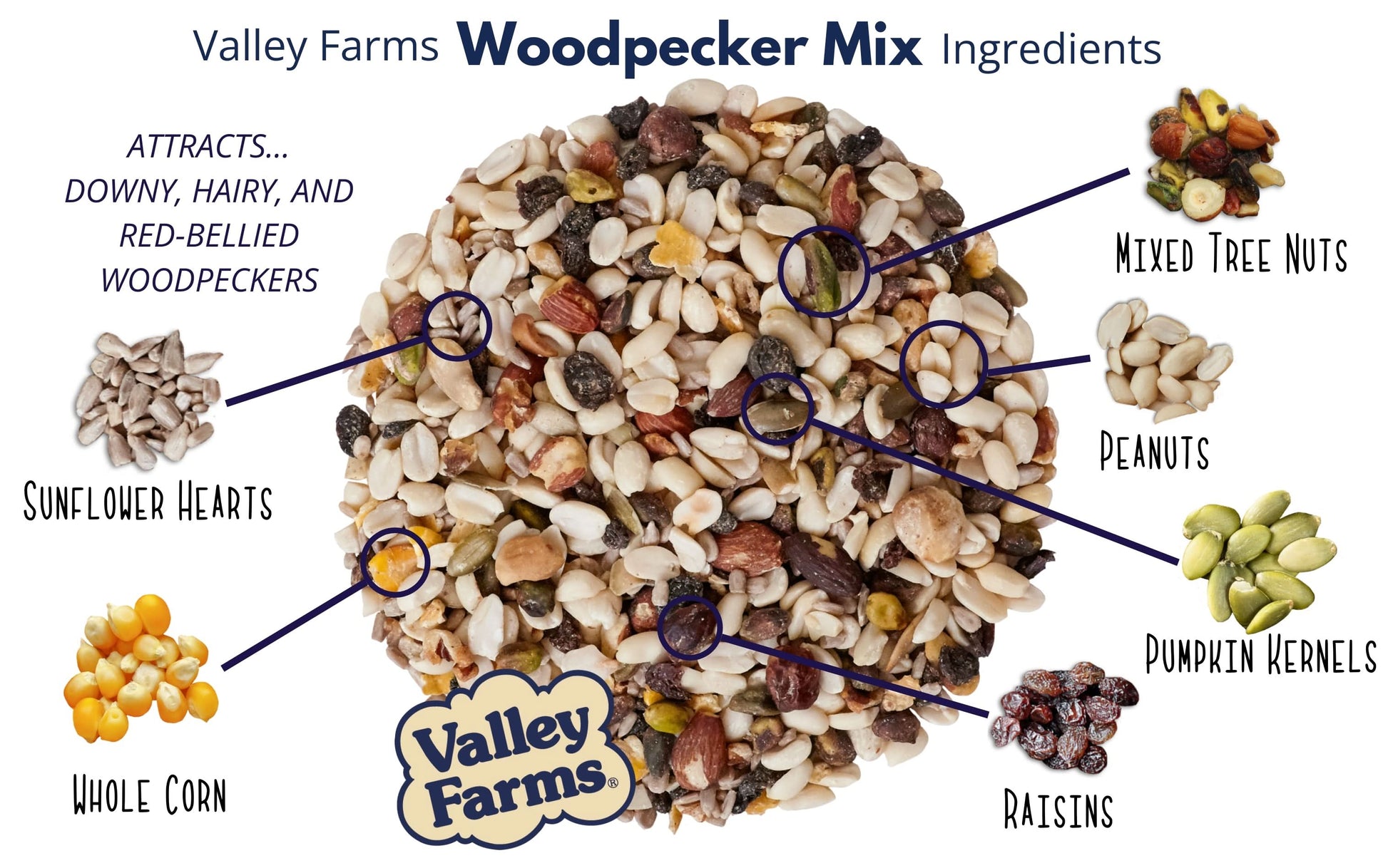 ★ Valley Farms® Woodpecker Mix Wild Bird Food is designed with the vast Woodpecker family in mind, but its fresh and effective ingredients will attract a wide variety of wild birds to your feeding stations!